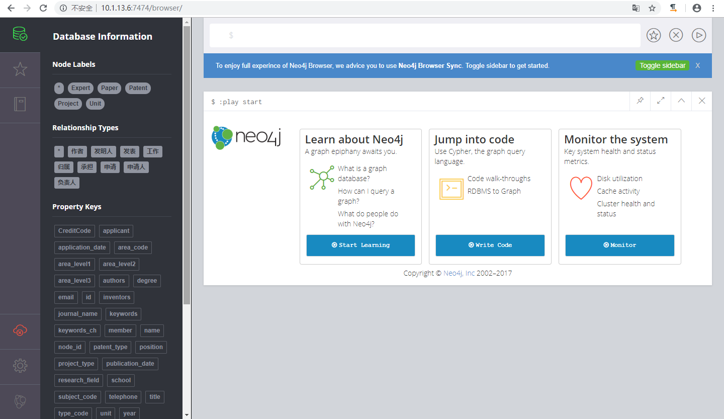 此时,访问7474端口就可以查看新创建的图数据库了。